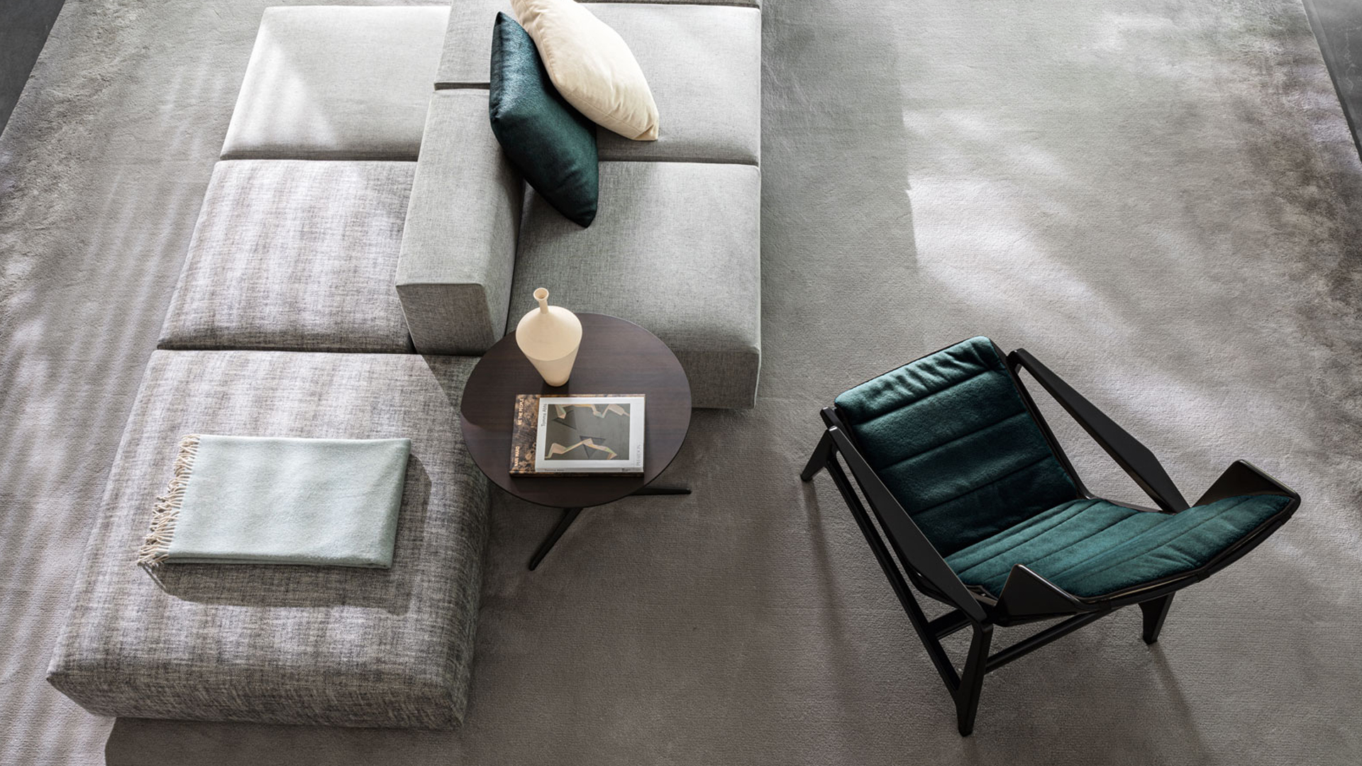 Gerade Teile und Eckelemente, klassische oder ausladende Armlehnen, trapez- und inselförmige Abschlusselemente, Sitzflächen und Rückenlehnen verschiedener Abmessungen für symmetrische oder asymmetrische Kombinationen, zusätzlichen Kissen und verschiedene Textilien für monochromatische oder farbkombinierte Effekte.