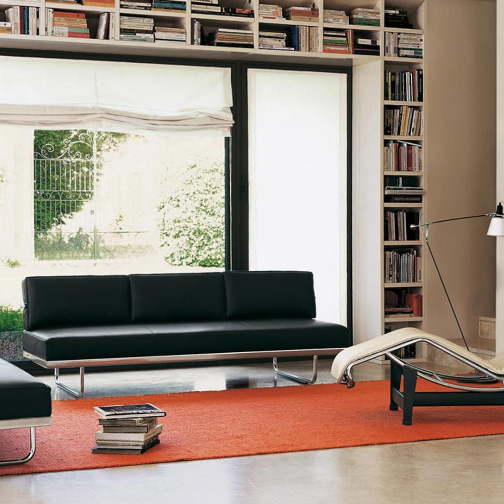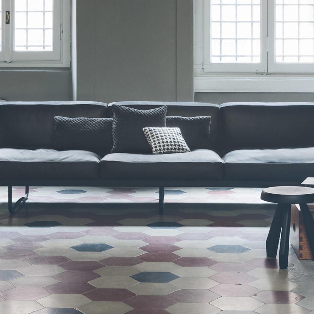 Sofas zwei- oder drei-sitzig mit Stahlgestell, glänzend dreiwertig-verchromt (CR3) oder in den Lackfarben grau, hellblau, grün, braun, schlamm, elfenbein oder schwarz halbglänzend lackiert. Kissen lose, Polsterfüllung in Daunen mit Synthetikkern. Bezug aus Leder oder Stoff. Plastikfüße.