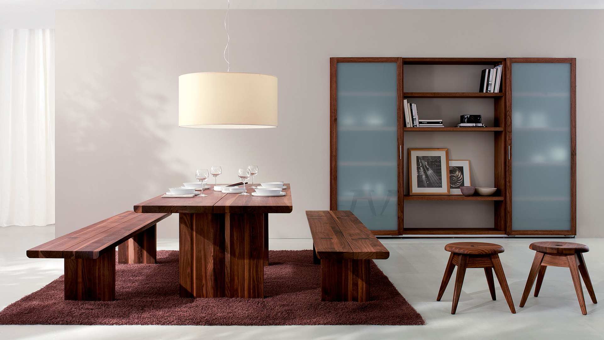 Tisch, der zur Gänze aus Massivholz hergestellt wurde, mit Tischplatte aus verleimten Leisten, kleinem Spalt in der Mitte und oben auf der Tischplatte sichtbaren Beinen.Mit abgerundeten oder geraden Kanten erhältlich. Endbearbeitung: Auf Grundlage von natürlichem Öl/Wachs pflanzlichen Ursprungs mit Fichtennadelextrakt.