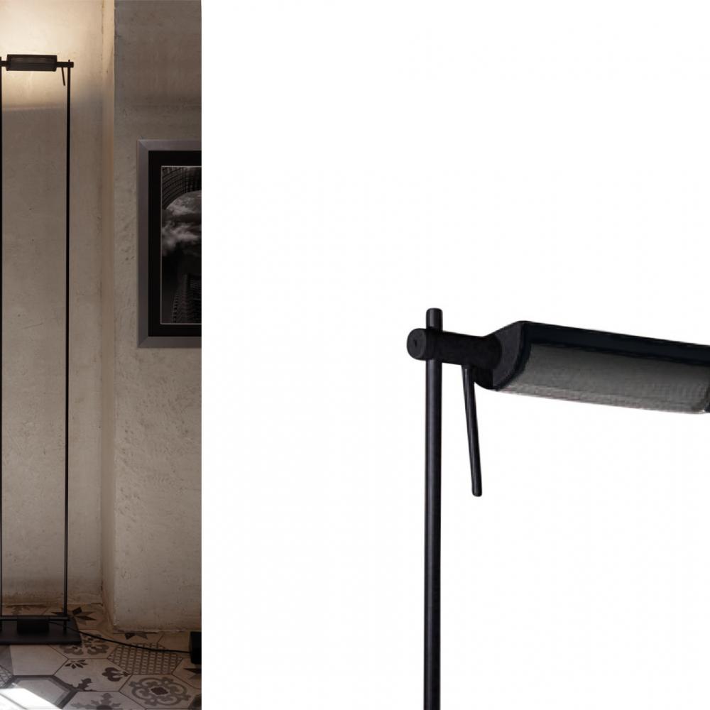 Famiglia di lampade da terra, parete e soffitto a LED e alogene con sorgente luminosa orientabile, in alluminio e polimero stampato.
