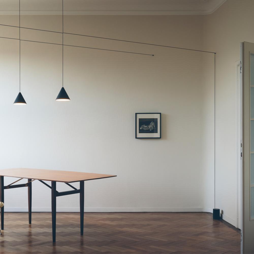 Lampada a sospensione a luce diffusa. Corpo in alluminio pressofuso verniciato nero opaco verniciato con vernice soft-touch trasparente. Diffusore ottico in PC opale. Sistema di sospensione di 12 metri con cavo coassiale rinforzato in Kevlar. Disponibile con attacco a parete / soffitto in PC nero e alimentatore con interruttore a pavimento in PC verniciato nero opaco. L'interruttore on / off è elettronico con meccanismo ottico. on / off e dimmer gestito tramite disponibile per l'applicazione di controllo remoto Android e Apple.