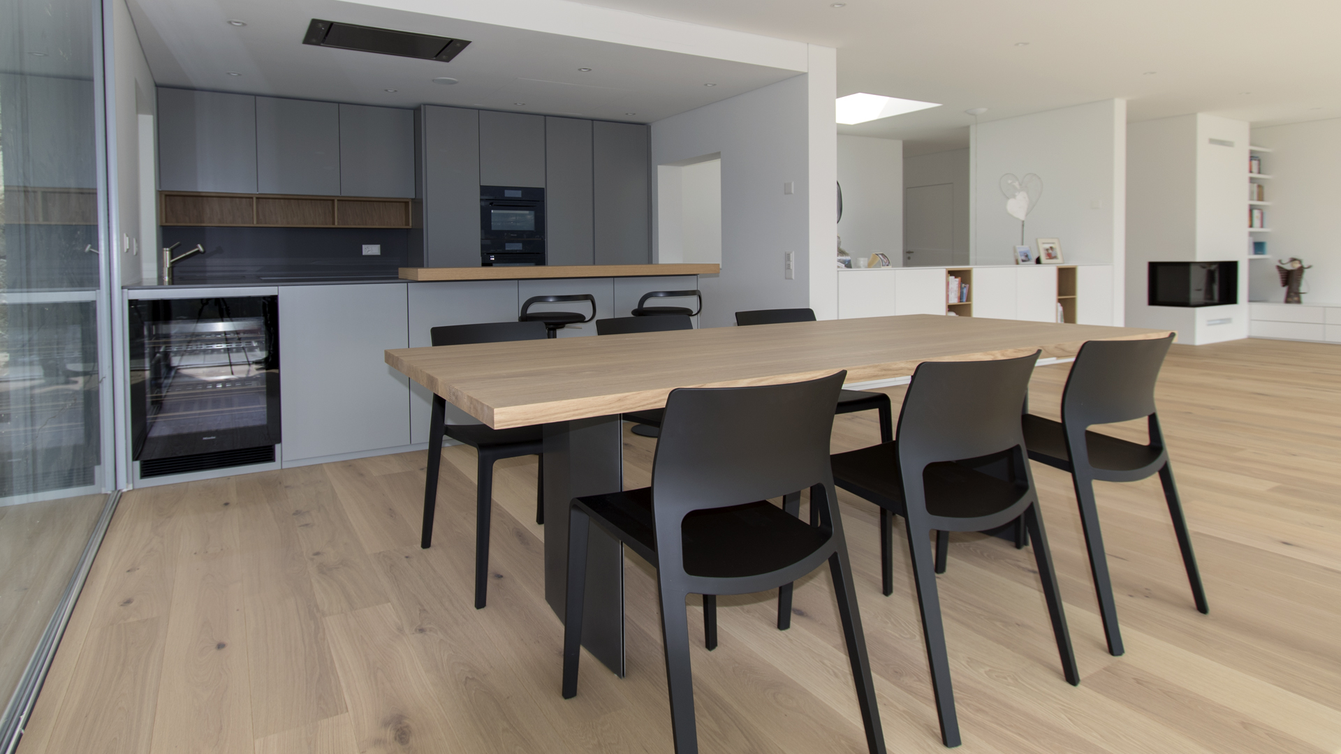 Orselina, arroccata sulla sponda destra del lago Maggiore, è una località a forte vocazione turistica costituita da abitazioni orientate verso il lago. La ristrutturazione di quella che era una vecchia locanda ha completamente modificato l’estetica e la funzione della struttura. Ampie vetrate sono contrapposte a elementi di arredo in legno di rovere. Lamelle verticali delimitano gli spazi e sorreggono gli scalini in legno massello. La cucina, elemento centrale del soggiorno, è lineare e pulita. L’assenza di maniglie e la continuità tra armadi, porta e rivestimento pareti crea un fondale neutro davanti al quale risalta l’isola con piano in acciaio massiccio.