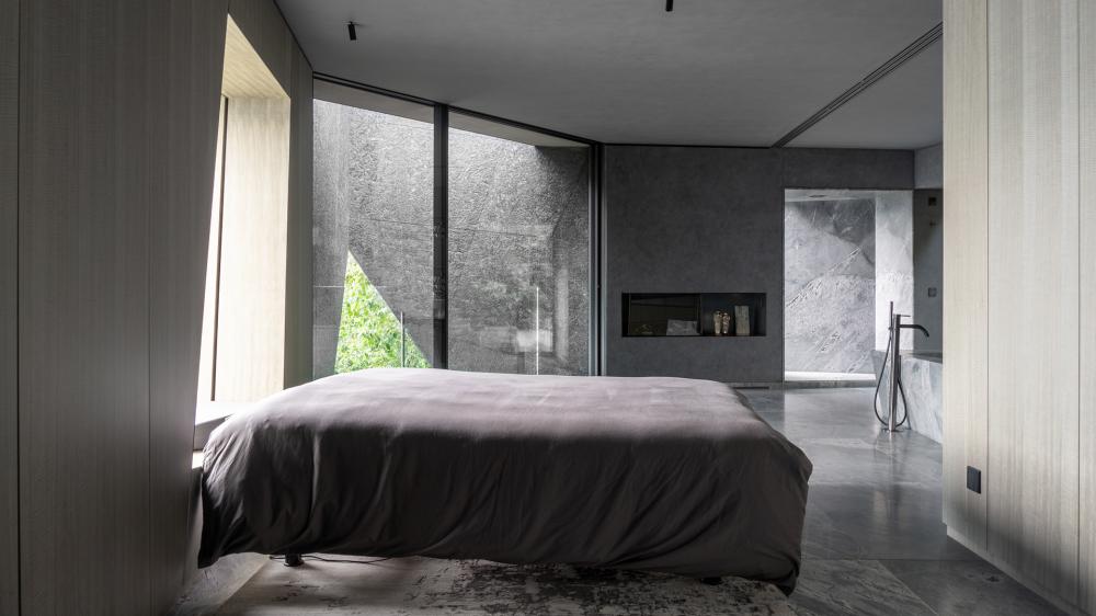 Situata nella frazione di Carasso la casa unifamiliare è stata orientata privilegiando due punti di vista. Il primo a cannocchiale sui tre castelli di Bellinzona ed il secondo sul giardino e vigneto. I fori sulla facciata sono accompagnati da pannelli in legno per l’oscuramento dell’edificio. Marcato è il contrasto tra calcestruzzo a vista e il calore degli elementi in legno. Contrapposizioni materiche che sono riprese all’interno dove le superfici bianche e il pavimento in granito vengono scaldate con i numerosi elementi in legno di rovere naturale.